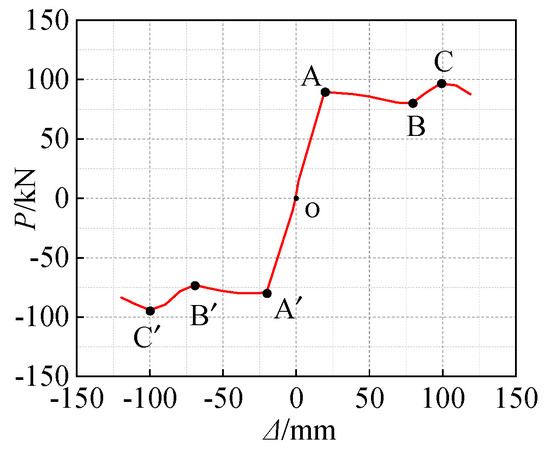 With references to the skeleton curves obtained from the test and parametric study, it was considered that the development of the load–deformation behavior experienced four stages, as demonstrated in Figure 16. By analysis, the initiation of the slipping behavior (Point A), the initiation of bearing behavior (Point B), and the initiation of degradation in performance (Point C) are the feature points during the whole loading process. From the initial loading to point A, the BCJ-BEDC was elastic, and the skeleton curve was linear. From point A to point B, the BCJ-BEDC was in the slipping stage, where the load did not change greatly with the deformation increasing. After Point B, the BCJ-BEDC entered into the bearing stage, and the bearing capacity was increased more quickly until reaching the peak point (Point C). Afterward, degradation in the performance occurred.