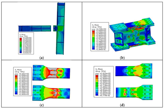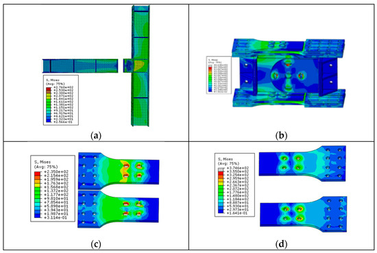 The stress nephogram at point C. (a) Framing components. (b) The BEDC. (c) The sliding steel fuses. (d) The FCPs.