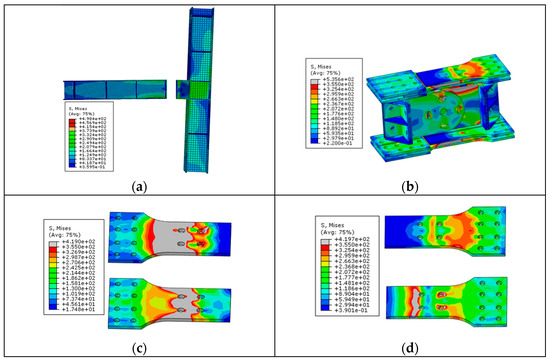 Figure 18 illustrates the stress condition and the damage development when loaded to Point B. The bolts collided with the edge of the slotted hole in the sliding steel fuses, and the stress in the framing components increased to 264.54 MPa, indicating that the stress development in the slipping stage was not significant. It was also concluded that the slipping behavior of the sliding steel fuse improved the stress development of the framing component. As for the BEDC, the maximum stress developed larger than the yield strength (284 MPa), which was generated around the bolting region of the sliding steel fuse (shown in Figure 18c). Compared with Figure 17c and Figure 18c, it was known that the sliding steel fuses experienced obvious stress development, which might be caused by the large flexure deformation. The stress in the FCPs was also more serious, while the plastic behavior was primarily concentrated in the sliding steel fuse.