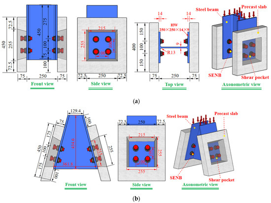 The push-out test is a cost-effective tool to study the shear behavior of shear connectors in steel-concrete composite beams. The design formulae in Eurocode 4, as well as in other design codes, were developed based on lots of push-test results. And it was also suggested that the shear strength of connectors can be directly determined through the push-out test. The results and conclusions from the push-out tests can be regarded as references for the design of the steel-precast UHPC composite structures. To determine the shear behavior of SENBs and studs in prefabricated steel-UHPC composite beams under combined tension-shear loading, ten samples were prepared in this study. In our previous study, the combination of UHPC slabs with a thickness of 75 mm and high-strength friction-grip bolts with a diameter of 22 mm and a strength grade of 12.9 allowed the specimens to present superior shear performance [48]. More recently, the feasibility of prefabricated steel-UHPC composite beams with grouped SENBs has been demonstrated through comprehensive experimental and numerical investigations. The typical configurations and dimensions of these samples were determined according to Eurocode 4 (2004) [49], as depicted in Figure 2. To analyze the structural performance of different shear connectors, these tests could be divided into two series, with each series consisting of one standard push-out (SP) and four modified push-out (MP) specimens. The SP sample represented a push-out sample under pure shear loading, in which the inclination angle was 90° from the horizontal interface, according to Figure 2a. Each push-out test was composed of a 450 mm high HW250 × 250 × 14 × 9 hot-rolled steel beam and two UHPC side panels. All precast panels were designed to represent the full-depth precast panels with the same geometric dimensions of 450 mm in height, 400 mm in breadth, and 75 mm in gauge. The steel and concrete sections were connected using two pairs of shear connectors arranged in two rows and two columns. These connectors had the same height of 60 mm and a longitudinal distance of 100 mm. In addition, these shear connectors were embedded in inverted conical shear pockets, which have dimensions of 255 mm × 255 mm on the outside and 215 mm × 215 mm on the inside on each side of the samples. Unlike the SP samples, the hot-rolled steel beams in all MP samples needed to be cut through the symmetry plane for the corresponding assembly process, as depicted in Figure 2b. The front face of the steel beam was trapezoidal with a thickness of 14 mm, while the other dimensions of the steel beam were variable as a function of the slope gradient of the steel-UHPC interface. Accordingly, the UHPC panels in all MP samples were 400 mm wide, 75 mm thick, and 450 mm high, but varied in height according to the tension-shear ratio. In addition, a height difference of 100 mm was established at the upper end of the steel and concrete sections. This was done to allow for interfacial sliding during testing.