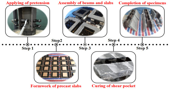 Figure 3 presents the manufacturing process for all samples. The fabrication of the steel beams was conducted before the fabrication of the concrete slabs. To minimize the difference in material properties among the concrete slabs, the steel beams were cut along the symmetry plane into two T-shaped sections. The flanges of the steel joists were supplied with bolted holes of the appropriate diameters. After the bolts had been installed in the precast holes, a preload was applied to the bolts. As shown in Figure 3, Step1, to ensure sufficient preload, the torque coefficient was tested using a torque wrench. As shown in Figure 3, Step2, twenty corresponding wooden formworks were made. Then UHPC was poured into wooden formworks to obtain the precast slabs with reverse shear pockets. These slabs were cured in a specific curing environment with temperatures exceeding 80 °C and a relative humidity of not less than 95% for three days after the hardening of the concrete (in 24 h). The cured slabs were then placed on the steel flange in accordance with Figure 3, Step3. Grease was applied to the steel flanges to relieve the surface adhesion between the steel and concrete components prior to the placement of the pocket concrete. The pocket connections on each sample were poured at the same time to minimize the effect of material properties. As shown in Figure 3 Step4, the curing procedure for the shear pocket concrete was the same as that for the precast panels. When the shear pocket concrete cured, two individual T-shaped steel beams were welded together to form the target push-out tests. Finally, the beams and precast slabs were leveled to minimize fabrication errors. Through the above-mentioned process, ten push-out samples were prepared and ready for load testing, as shown in Figure 3 Step5. Six cylindrical samples (ɸ 100 × 200 mm2) were manufactured for each batch and were hardened under the same circumstances to evaluate the physical characteristics of the concrete.