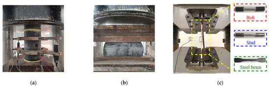 Mechanical property testing for steel productions. (a) Compressive test for UHPC. (b) Splitting tensile test for UHPC. (c) Tensile test for steel productions.