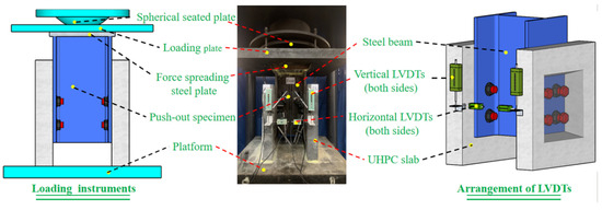 At the Bridge Laboratory of the Guangdong University of Technology, China, all push-out investigations were carried out on a 500 T compression machine (Figure 5). This 500T compression machine with the serial number YA2005114S was an automatic pressure testing machine that was made by Zhejiang Schlikor Equipment Manufacturing Co., Ltd. in China. To guarantee consistent load transfer, a 25 mm thick force-expanding steel plate was used on the upper side of the sample, and a thin coating of high-strength gypsum was used between the sample and the machine platform for stress transfer on the upper/lower sides of the sample. Eight linear variable displacement transducers (LVDTs) were installed to track the displacement during the push-out tests (Figure 5), including four 50 mm LVDTs oriented vertically to gauge the relative longitudinal slip between the steel beams and the UHPC slab, and four 10 mm LVDTs oriented horizontally to measure the relative transverse displacements. These transducers were attached to the four edges of the sample at a height equal to the center of the shear pocket.