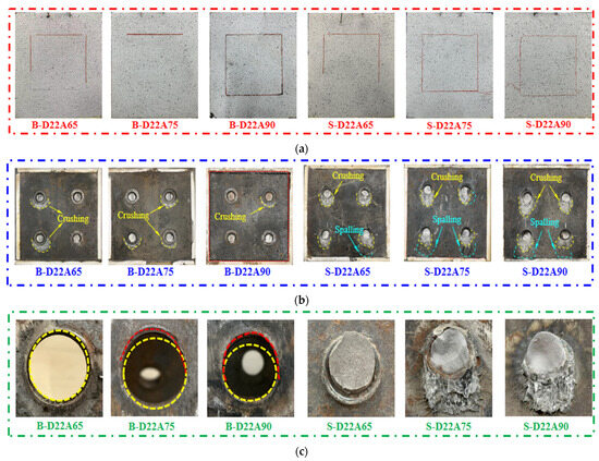 Figure 6 illustrates the typical failure modes and close-up views of the samples. It could be noticed that there was a slight difference in the fracture appearance on the outer side of the concrete slab for the samples from Series I. Figure 6a showed that cracks were found only around the shear pockets on the outside of the slab, but only a small number of fractures were seen on the exterior of the concrete slab of sample B-D22A75. As displayed in Figure 6b, the samples exhibited concrete crushing in the region near the root of the bolt. This localized concrete crushing in the vicinity of the connector root was due to the large bearing pressure at the steel-concrete joint [55]. The failure pattern was controlled by the fracture of the bolts adjacent to the beam-pocket interface, with only a small portion of concrete damage below the bolt roots. According to Figure 6a,b, no evident variation in crack development and failure in the regions close to the bolt root was found in samples with different tension-to-shear ratios, which might be related to the small diameter of the SENBs.