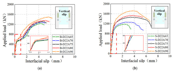 Figure 7 illustrates the relationships between the exerted load and the vertical interfacial slip (referred to as the “load-slip relation”). The shear capacity was defined as the load applied to each connector, while the slippage at the interface was specified as the average recorded value of the four LVDTs installed in the vertical direction. As shown in Figure 7, the minimum value of the load applied to the push-out specimens was 0. For Series I specimens, the maximum loads applied to the specimens from B-D22A90 to B-D22A65 were: 1497, 1351, 1319, 1294, and 1243 kN. For Series II specimens, the maximum loads applied to the specimens from S-D22A90 to S-D22A65 were: 1724, 1533, 1464, 1269, and 1184 kN.