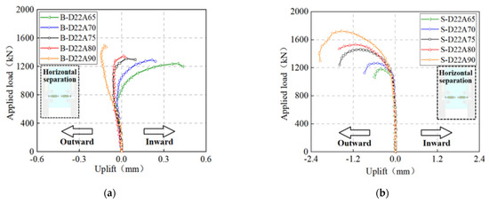 It could be found that most of the curves for the Series I samples expanded first in the negative direction and then in the positive direction as the load increased, indicating the first outward separation between the steel and concrete components. Subsequently, the precast panels exhibited an inward rotating tendency to separate due to the lateral separation of the bolts. Even with loads up to 0.8, uplift was observed to range from a negative value of 0.2 mm to a positive value of 0.2 mm, which was less than 7% of the corresponding interfacial slip. However, except for the sample with a large angle (B-D22A90), the plate tended to rotate inward before reaching the peak load.