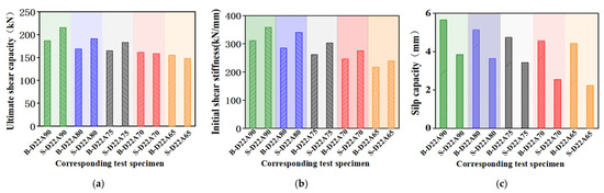 Influences of angle on the shear behavior of connectors. (a) Ultimate shear capacity. (b) Initial shear stiffness. (c) Slip capacity.