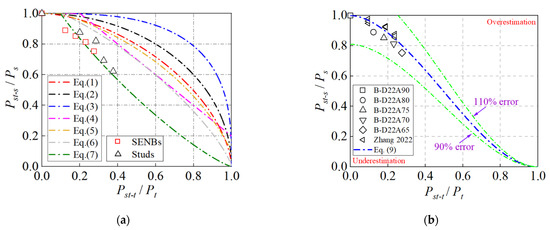 As shown in Figure 11a, none of the above design-oriented models could accurately predict the tensile-shear relationships of the two series of push-out samples with squared correlation coefficients, ranging from 0.75 to 0.95. Of these, Equation (7) had a squared correlation coefficient of 0.95, which was a better predictor of the experimental performance of the Series I and Series II samples. The squared correlation coefficient for other models ranged from 0.75–0.71. The existing models were inherently flawed due to their reliance on test results obtained from bolts subjected to mixed tensile and shear loads in a non-conforming environment (NC). In addition, Zhang et al. [59] conducted a study on the shear behavior of high-strength friction-type gripper bolts (HSFGB) under both tensile and shear loading, which also investigated the shear behavior of high-strength bolts and was similar to the tests on the Series I samples in this investigation. However, Equation (3) presented by Zhang et al. [59] was based on high-strength bolts embedded in NC, which differed from this study. Therefore, it was necessary to develop a more appropriate model for predicting the tension-shear relationship of SENBs in prefabricated steel-UHPC composite beams.