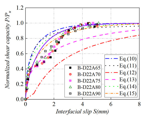 Therefore, an equation for accurate prediction of the coupling strength by a simplified design procedure has been proposed based on Equation (3). This equation (Equation (8)) quoted the exponential expression of Equation (3), where α and β were the undetermined coefficients. and were the tensile component and shear component of the shear bond subjected to the combined tensile-shear load, respectively; was the ultimate load carrying capacity of the push-out sample under the combined tensile-shear load; was the ultimate shear resistance of the push-out sample under a pure shear load; and was the ultimate tensile resistance of the push-out sample under a pure tensile load. In this study, the calculation method in PCI 5th was used, i.e., , the value was equal to ; was the number of bolts in the sample, was the cross-sectional area of the shear connector embedded in the UHPC, and was the ultimate tensile strength of the shear connector. The undetermined coefficients in the improvement equation were re-determined by fitting the regression analysis technique, and the final formula was obtained as shown in Equation (9).