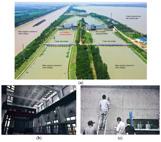 - Zhou, J.; Cao, Q. Report of the On-Site Test of the Concrete Structures in the No. 3 Huaiyin Pumping Station; Testing Center of Yangzhou University: Yangzhou, China, 2017; pp. 1–30. [Google Scholar]