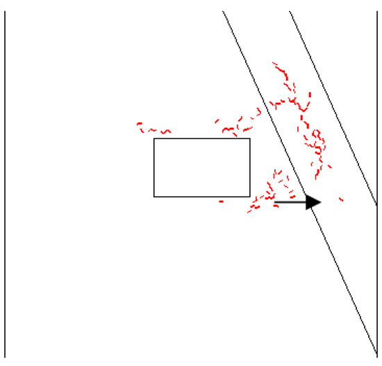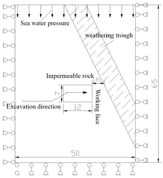 According to the probe test, the maximum water pressure of the F1 weathered deep groove is 0.3–0.5 MPa, and the maximum water inflow of a single hole is 50 m3/h. The influencing factors of water inrush in submarine tunnels mainly include the water source, water pressure, water barrier, geological structure and tunnel construction behavior. The geometric shape of the longitudinal section of the tunnel is equivalent to a rectangle according to the condition of an equal area. According to the spatial relationship between the F1 weathering groove structure and the longitudinal section of the tunnel, when the weathering groove is located obliquely above the tunnel, the longitudinal upper and lateral cross water inrush model is established (Figure 2). When the weathering trough is located obliquely below the tunnel, it establishes a longitudinal downward and lateral cross water inrush model.