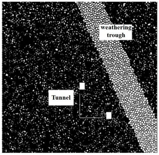 There is a process of trial and error for obtaining appropriate meso-mechanical parameters from macro-mechanical parameters, because there is no theory to support the correlation between the two sets of mechanical parameters [8]. In view of the different computational mechanical parameters of the tunnel surrounding the rock and weathering trough rock mass, considering the calculation amount and calculation accuracy requirements, the parameters of soil particles and fluid domains can be found in the literature [18,19,20].