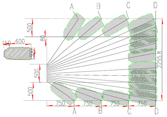 Longitudinal section of the Malisan grouting borehole (unit: cm). (A, B, C and D are position of grouting end; color is grouting diffusion range).