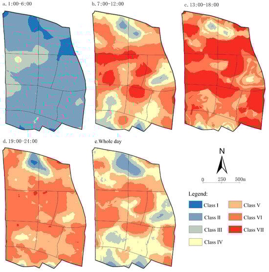 - The heat data were selected to be divided into four time segments for congestion studies in segment a (1:00–6:00), segment b (7:00–12:00), segment c (13:00–18:00), and segment d (19:00–24:00). We processed data on a GIS platform and classified the population congestion into 7 grades: very low, lower, low, average, high, higher, and very high, which are 7 levels (Figure 2).