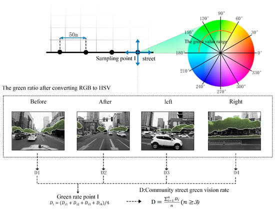 - In this paper, the streetscape images were derived from web-scraped September 2022 data, which were sampled at 50 m intervals in four directions, 0°, 90°, 180°, and 270°, for a total of 1896 images. The image was converted from RGB to HSV, and the color pixels in the HSV channel from 60–180° were extracted and counted, and then systematically analyzed by formulae and MATLAB (2021a) software to calculate the percentage of green (Figure 3).