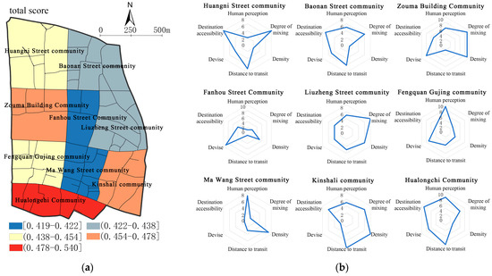 - At the community level, the Ma Wang Street Community and the Fanhou Street Community scored lower. The Ma Wang Street Community is at a poor level in four dimensions: degree of mixing, distance to transit, devise, and destination accessibility. The Fanhou Street Community is at a poor level in four dimensions: human perception, degree of mixing, distance to transit, and destination accessibility.