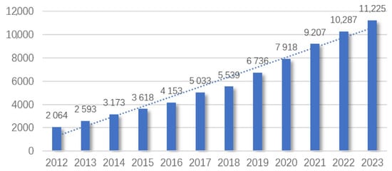 An urban rail transit project is a common infrastructure project in many countries and is very important for urban traffic development, regional economic prosperity, and the improvement of people’s quality of life. According to the “Annual Statistics and Analysis Report of Urban Rail Transit 2023”, by the end of 2023, 338 urban rail transit operation lines had been opened in 59 cities in China, with a total length of 11,224.54 km. As shown in Figure 1 and Figure 2, the growth of China’s rail transit projects in recent years.