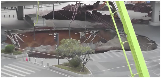 On 1 December 2019, a ground collapse occurred in the construction area of Shahe Station of Guangzhou Metro Line 11, as shown in Figure 3. The direct cause of the accident was the superposition of a special geological environment and other factors encountered in the construction of the underground excavation method, which caused the permeable collapse of the vault of the tunnel face. The indirect cause was that there were two abnormal water seepage falling blocks during construction, but it did not attract enough attention from the project department and did not prevent the accident in time.