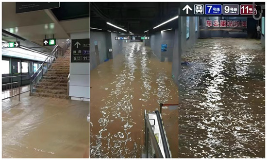 On 20 July 2021, Zhengzhou continued to suffer from extremely heavy rain, causing severe urban waterlogging, as shown in Figure 4. Water accumulated to break the water retaining wall of the entrance and exit line into the mainline section, resulting in a train on Line 5 being surrounded by floods, causing casualties. The direct cause of the accident is the poor handling by the relevant parties, the failure of traffic command and dispatch, the illegal change in the design of the parking lot, and the lax control of the construction quality of the water retaining wall.