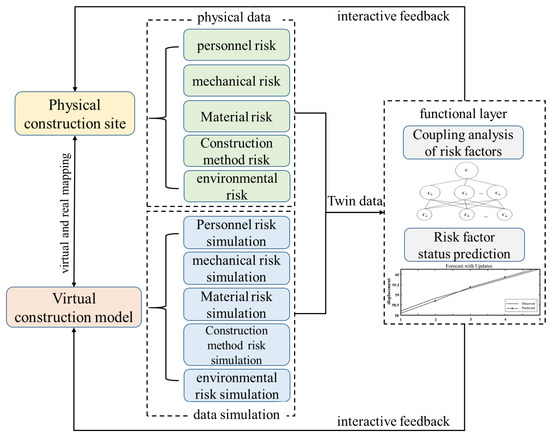 Based on the digital twin five-dimensional model constructed by Tao Fei [10], some scholars have proposed a multi-dimensional model of subway tunnels based on digital twins. The main framework is the physical layer, the virtual layer, the functional layer, and the connection between layers, as shown in Figure 9. The physical layer includes the subway tunnel construction site entity and the sensor equipment used to collect data during the construction process, such as vibrating string strain gauges, laser convergence meters, vibration sensors, gas monitors, and accelerometers for monitoring deformation and construction quality. The construction physical entity includes various information, such as personnel information, mechanical equipment information, construction material information, construction method information, and construction environment information (human, machine, material, method, ring), which are collected by various sensors and fed back to the digital twin model of the virtual layer in real time [9]. The virtual layer is the core of the framework, which not only includes the digital twin model that integrates all kinds of information data in the construction process but also includes the machine learning algorithm model for analyzing the massive data generated in the construction process and the simulation data of the digital twin model. Its main body is a multi-dimensional set model, including three dimensions of geometry, physics, and semantics. The functional layer includes functions such as risk factor coupling analysis and risk factor prediction. The functions are realized based on the virtual layer, which guides the construction process of the physical world. In summary, the physical layer is the foundation and data source of the virtual layer, the virtual layer is the means and basis of the functional layer, and the functional layer is the basis for the physical layer to carry out the risk management of the construction process.