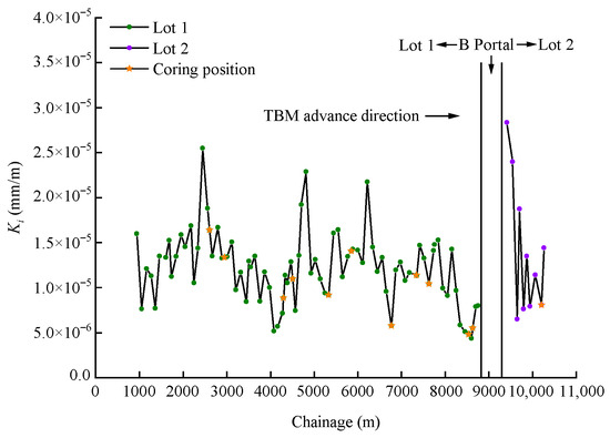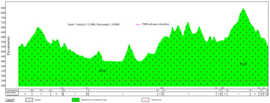 In this paper, the studied project is a water conveyance tunnel with a diameter of 8.50 m and a length of 10 km. The geological profile of the tunnel is shown in Figure 1. The lithology of the surrounding rock is Proterozoic intrusive rock, which is mainly giant porphyritic granite composed of feldspar, quartz, hornblende, and dark minerals. The tunnel wall is mainly dry or locally moist, without an obvious groundwater overflow phenomenon. The joint surfaces are undulating and rough, with some mostly closed and a few slightly open. The surrounding rock is basically stable. The rock mass classification of the studied tunnel was carried out by the hydropower classification (HC) method [2], and the proportions of classes II, III, and IV of the rock mass classification were 81.28%, 16.19%, and 2.53%, respectively.