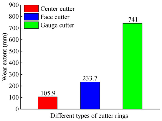 The ratio of the accumulated wear extent to the cutter number for different types of disc cutters is defined as the accumulated wear extent of the average single cutter position, which were 105.9 mm, 233.7 mm, and 741 mm, respectively, for the center cutter, face cutter, and gauge cutter in this study, as shown in Figure 5. The accumulated wear extent of the average single cutter position of the gauge cutter was about three times that of the face cutter and seven times that of the center cutter. This is because the gauge cutter is subjected to both primary wear and secondary wear. Furthermore, the installation radius of the gauge cutter is larger, and the accumulated wear extent of the gauge cutter is also larger (see Figure 4a), so its wear situation is the most serious.