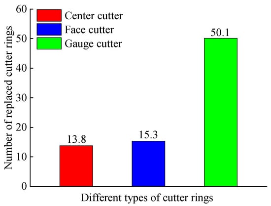 The ratio of the total number of replaced cutter rings to the cutter number for different types of disc cutters is defined as the number of replaced cutter rings for the average single cutter position, which were 13.8, 15.3, and 50.1, respectively, for the center cutter, face cutter, and gauge cutter in this study, as shown in Figure 6. The number of replaced cutter rings of the average single cutter position of the gauge cutter was about 3–4 times that for the center cutter and face cutter, which is mainly because, as can be seen in Figure 5, the accumulated wear extent of the average single cutter position of the face cutter was larger than that of the center cutter, but the allowable wear limit of the cutter ring of center cutters is less than that of face cutters (see Table 2), so the number of replaced cutter rings of the average single cutter position of both is comparable. Most new cutters are preferred to be used in the gauge cutter area. Then, the normal-wear cutters are transferred to the face cutter area for sequential use, and the allowable wear limit of the cutter ring for gauge cutters is the lowest (see Table 2). Additionally, the wear rate of gauge cutters is the fastest, so the number of replaced cutter rings for the average single cutter position of the gauge cutter is much larger than that of the center cutter and face cutter.