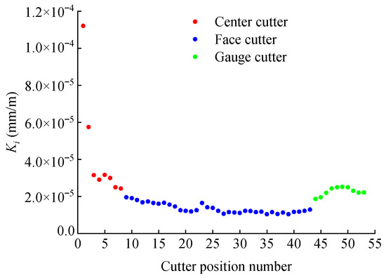As shown in Figure 4b, for the center cutter, the cutter ring needs to be replaced at the same time as its double ring, and the data points of the accumulated replacement number appear in pairs. The difference between the maximum number and the minimum number of cutter replacements was only four in this research. For the face cutter, the accumulated number of replaced rings shows a linear growth trend with the increase in the installation radius. This is because the rolling distance and linear speed both increased with the increase in the installation radius, but the allowable wear limit of the cutter ring is a fixed value (see Table 2), so the accumulated replacement number of cutter rings increased linearly. For the gauge cutter, the allowable wear limit of the cutter ring shows a step-type decreasing trend with the increase in the installation radius, and the corresponding value of the last cutter position (disc cutters 52 and 53) is the smallest (see Table 2). Therefore, except for the last cutter position, the accumulated replacement numbers of cutter rings show little difference.