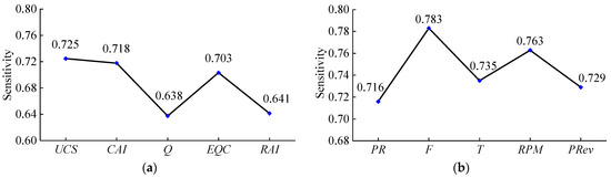 As shown in Figure 10a, the order of the sensitivity of the cutter ring wear rate of the face cutter to the five intact rock parameters from largest to smallest was UCS, CAI, EQC, Q, and RAI. This suggests that a single Q value cannot reliably predict cutter wear. Logically, the greater the proportion of hard minerals (specifically quartz) in a rock, meaning that the rock is harder, the greater its abrasiveness. Additionally, the structure of the rock itself influences the cutter wear; thus, the sensitivity of the EQC rises when considering the rock’s mineral composition and hardness. Furthermore, it was discovered that the sensitivity of RAI, derived from multiplying the two highly sensitive UCS and EQC, decreases. This is associated with the principles of grey relational analysis. In the calculations, both the reference and comparison sequences were normalized. If the trends in these sequences are aligned, indicating a high degree of synchronous change and a correspondingly high level of correlation between the two, then the resulting multiplication amplifies any lack of correlation between the new sequence and the reference sequence, thereby reducing the sensitivity of the RAI.