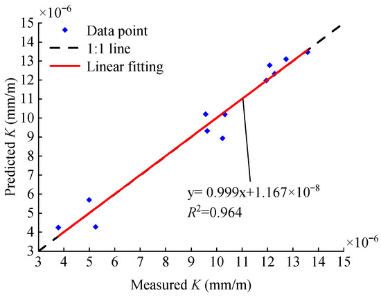 Figure 11 shows a comparison of the measured and predicted values of K. It can be seen that the predicted values calculated according to Equation (9) are close to the measured values, which verifies the accuracy of the developed model.