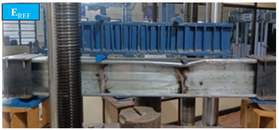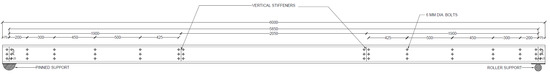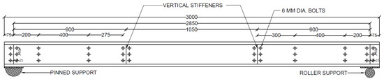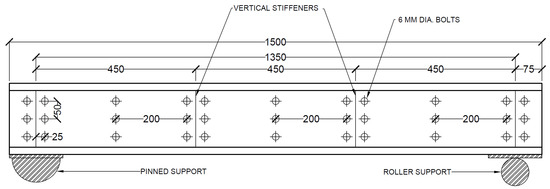 After the heating and cooling phases, the beams underwent testing on a Universal Testing Machine (UTM) under two-point loading conditions. Vertical stiffeners, 2 mm thick, were welded to the beams at both supports and two loading points, as shown in Figure 1. These stiffeners were incorporated to prevent twisting and lateral buckling during testing. Two-point loading was applied to simulate the flexural behavior of the beams. Specimen IDs and abbreviations are provided in Table 2.