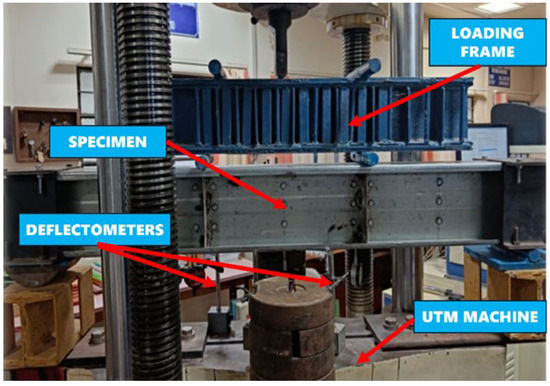 Deflectometers were placed beneath the bottom flange of the section at both loading points and at the midpoint of the beam. Linearly variable differential transducers (LVDTs) were attached to the side of the web of the beam to measure deflections. The experimental setup is shown in Figure 6.