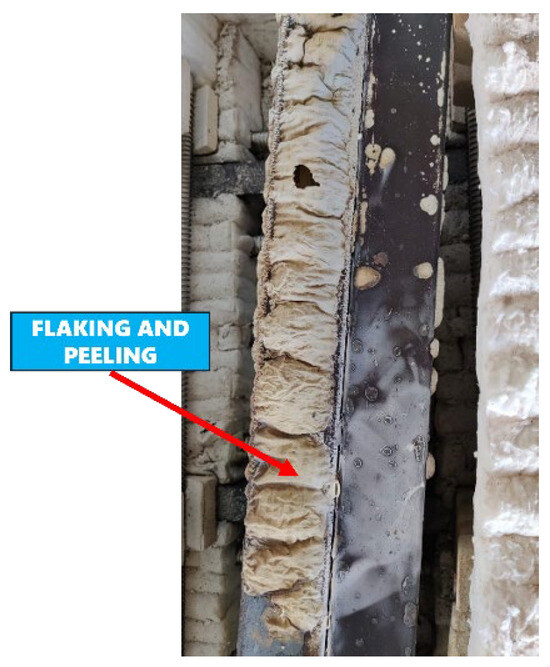 Prior to the heating process, the beam sections exhibited a uniformly light glossy gray color, as depicted in Figure 6. Following the heating procedure, visible flaking appeared on the surface, as illustrated in Figure 7. After 60 min of heating, the observed color was dark blue. Additionally, a noticeable presence of brown dust was observed on the surface of all specimens.