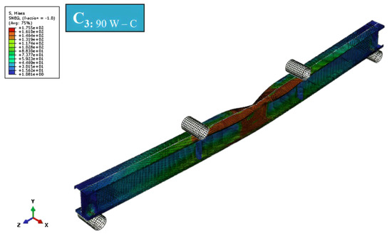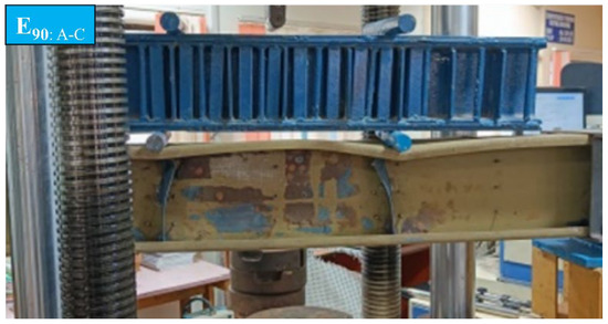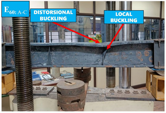 After testing, the specimens exhibited distortional buckling and local buckling for all durations of heating. Particularly, local buckling was evident on the stiffeners situated beneath the loading points, as shown in Figure 8, Figure 9 and Figure 10. After 90 min of heating, the color pattern is changed to a greenish-olive shade, as depicted in Figure 10. Distortional buckling occurred in the middle region of the beams, indicating compression failure at the top flange. The addition of stiffeners on bearings and the restrained supports effectively prevented lateral-torsional buckling.