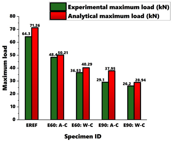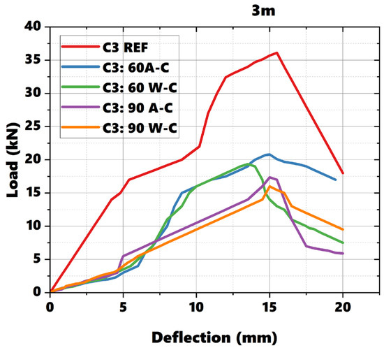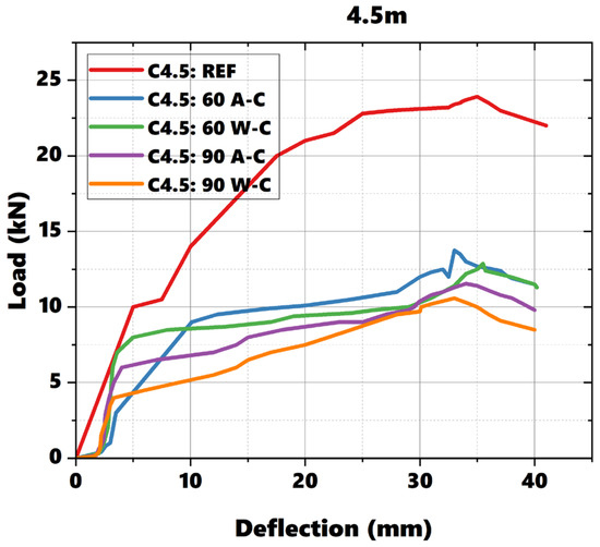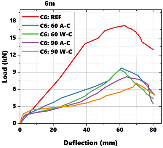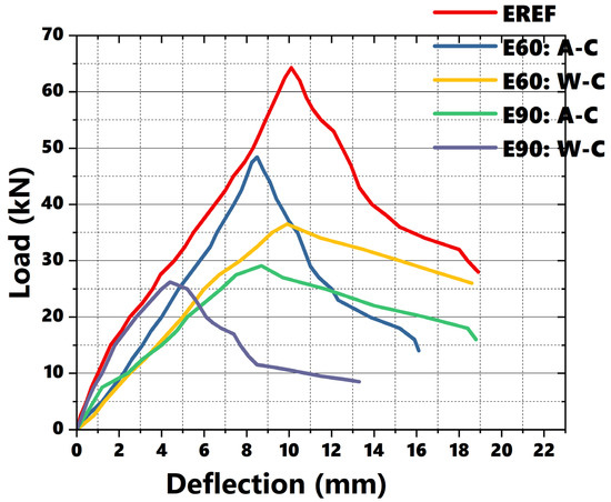Figure 11 depicts load–deflection graphs for beam sections tested in the experiment. The graphs show that as temperature increases, load capacity decreases. Beams cooled with water generally exhibit lower loads compared to those cooled with air. The maximum load observed was 64.3 kN for the reference specimen, while the minimum was 26.2 kN for the 90 min heated specimen cooled with water, a difference of 59.27%. Significant load decreases were noted, especially for the 60 min heated section cooled with water, showing a 24.53% lower load compared to air-cooled sections. Factors beyond heating and cooling, like material degradation due to prolonged exposure to high temperatures, affect load capacity.