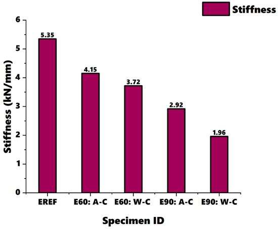 Stiffness values, derived from the load–deflection curves (Figure 12), decrease as the heating duration increases. The reference section exhibits the highest stiffness, while the 90 min heated section cooled with water shows the lowest stiffness, with a difference of 92.76%. A notable stiffness drop is observed for the 90 min heated sections. A 34.8% difference in stiffness is noted between the 60 min and 90 min heated sections cooled with air.