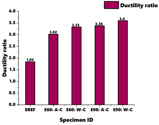 Figure 14 shows ductility index values for all sections. The ductility index is a measure of ductility, often used to compare the ductile behavior of different materials or structural systems. It is the ratio of energy absorbed in plastic deformation to the energy absorbed in elastic deformation.