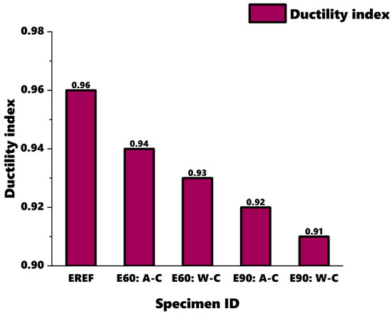 The ductility index generally decreases with higher temperatures. The reference specimen has the highest index, while the 90 min heated section cooled with water has the lowest, with a 5.35% difference. Water-cooled sections generally exhibit lower indices compared to air-cooled sections. A higher index indicates greater plastic deformation capacity, which is desirable for designs focusing on lateral load resistance. The ductility index is calculated using Equation (3),
