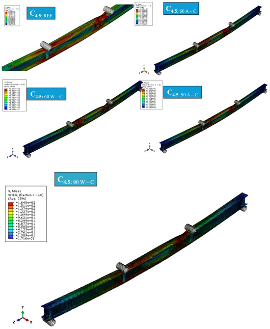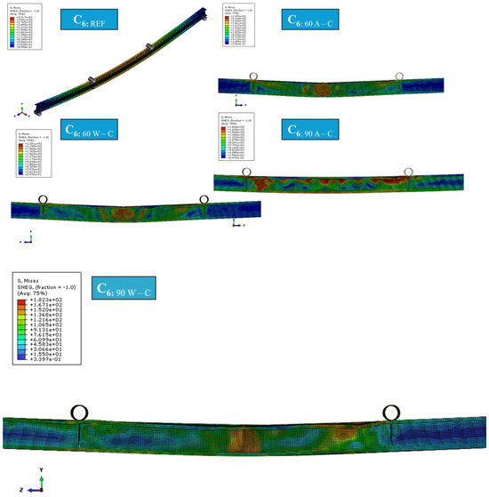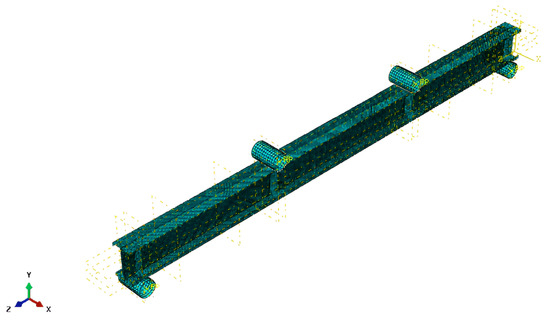 S4R elements were used to model all components of GI-based CFS beam sections, known for accurately representing these beam types [19,20]. A mesh size of 5 × 5 mm was adopted based on prior research [21] to balance computation time and result accuracy (see Figure 15). Tie constraints were implemented to replicate the presence and interactions of self-tapping screws within the beams, ensuring accurate simulation of their behavior.