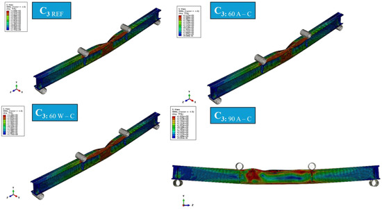 Distortional buckling was identified as the primary failure mode, with occasional local buckling under loading points on stiffeners. Failure modes observed in FEM models closely mirrored experimental observations (Figure 17, Figure 18 and Figure 19). Load–deflection curves from FEM analysis (Figure 20, Figure 21 and Figure 22) showed reduced load-carrying capacity with increased heating duration, consistent with experimental findings. Figure 23 illustrates load comparisons between experiments and FEM analysis, highlighting significant reductions in load capacity with increasing span lengths and heating durations.