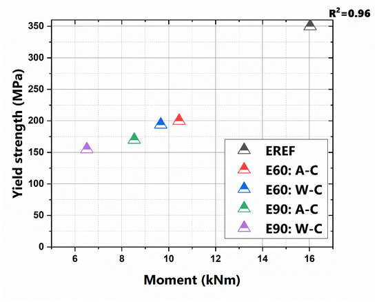 Figure 24 depicts a relationship between yield strength and moment capacity derived from experimental loads across different heating and cooling durations. A noticeable trend indicated that as yield strength decreased, moment capacity also decreased. This reduction depended on the heating duration and cooling method, emphasizing the critical role of yield strength in resisting bending moments and structural integrity under thermal stress.