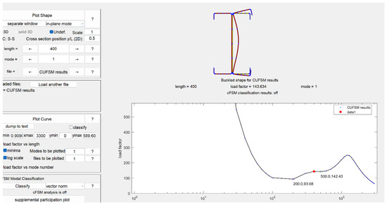 Figure 25 illustrates the signature curve derived through CUFSM [22] for reference beam sections. These curves provide valuable insights into the thermal stress-induced behavior of the beam sections, enhancing our understanding of their performance. The signature curve represents the relationship between the axial strength and slenderness of a structural member. It helps in characterizing the buckling behavior of cold-formed steel members under different loading conditions, such as axial compression, bending, and shear. The curve aids in identifying the critical buckling load for members, which is essential for assessing their stability. By plotting the load versus slenderness, one can determine the point at which the member will buckle. As the slenderness ratio increases, the strength of the member typically decreases.