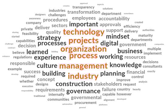 After the data was transcribed, it was reviewed multiple times, and each transcript was validated against the audio recording and saved as a Word document. After reviewing the transcripts, the researcher highlighted critical quotations to develop the codes. The coded data were grouped into codes according to the initial TOE framework (Figure 1). Figure 2 presents the frequency of terms used in the interviews in a word cloud, which facilitates the identification of emergent codes and themes.