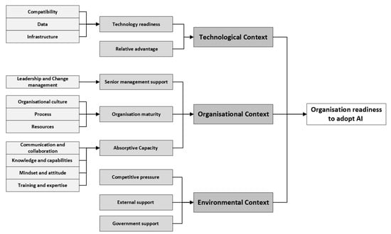 Numerous theoretical frameworks have been established and introduced to understand the adoption of new technology, addressing both individual and organisational contexts. Individual behavioural theories, such as the technology acceptance model (TAM) and the theory of planned behaviour (TPB), are commonly employed to predict intention and actual behaviour among individuals. In contrast, numerous frameworks and theories have been developed when examining the adoption of innovations within organisations, such as the diffusion of innovation theory (DOI) [], the TOE framework [] and the TAM []. The TOE framework is one of the most frequently employed models, which enables the modification and enhancement of variables in accordance with a study’s specific context [,]. It allows for a multidimensional understanding of an organisation’s readiness to adopt AI. The framework offers a comprehensive understanding to assess the three dimensions, technological, organisational, and environmental, making it essential to formulate specific strategies to facilitate the successful adoption of technology. Despite its flexibility, the TOE framework is subject to limitations, such as a lack of specificity, potential overlapping constructs relating to the technological, organisational, and environmental factors, context-specific variability, and complexity in implementation, despite its comprehensive scope and adaptability. Therefore, this study adapts the TOE framework, as it is recognised for its capacity to assess the degree of organisational readiness and its ability to adapt to different contexts [,].