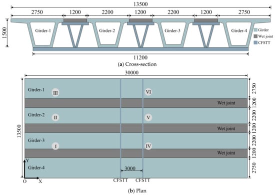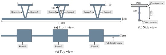 The CFSTT consists of three support plates, six diagonal braces, and one continuous bottom beam. Its dimensions were determined based on previous research [,,,], as shown in Figure 6. The dimensions of the support plates are 1400 mm × 1500 mm × 100 mm, and the continuous bottom beam measures 11,200 mm × 200 mm × 150 mm. The width and thickness of the diagonal braces are both 100 mm. The steel used for the CFSTTs and the diaphragms has a density of 7.85 × 103 kg/m3, an elastic modulus of 3.45 × 104 MPa, and a Poisson ratio of 0.3. The reinforcement of the concrete diaphragm board is set according to the “General Drawing of Highway Bridge (Plate girder series, box girder series)” [], and their arrangement in the PCB bridge is shown in Figure 7.
