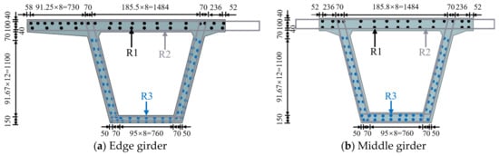 The steel bars were simplified using the constant reinforcement principle. The common steel bars in PCB bridges are divided into R1, R2, and R3 types; the elastic perfectly plastic model was adopted for the reinforcements in this study. The layout of the steel bars for the edge and middle girders is shown in Figure 3, and the material parameters of the ordinary steel bars are listed in Table 2.