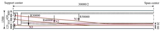 The linear elastic constitutive model is used to establish the prestressed tendons. According to the length, area, radius, and initial angle of the prestressed tendons, the prestressed tendons are divided into three types—N1, N2, and N3, as shown in Table 3. According to the cooling method to simulate prestress, the calculation formula of the temperature drop value is shown in Equation (1). N1, N2, and N3, respectively, represent three prestressed steel strands with high-strength relaxation at the base. Specifically, N1 consists of five 5 15.2 prestressed steel strands (15.2 represents a 15.2 mm diameter of the prestressed steel strands), with a total length of 30,760 mm; N2 and N3 consist of four 4 15.2 prestressed steel strands, with a total length of 30,810 mm and 30,660 mm, respectively. The inner diameter of the embedded bellows is 55 mm, the wall thickness is 25 mm, and the extension at both ends is 209 mm. Table 4 gives more information about the prestressed tendons. The prestressed tendons of the side beam and the middle beam are the same, and each main beam in the PCB bridge model has six prestressed steel strands passing through the web and bottom plate. Figure 4 takes the middle beam as an example to show the position of the prestressed tendons of the support and mid-span section; the profile is shown in Figure 5. As the prestress of the steel strand decreases with the service life of the bridge, according to the study of EC [], it is calculated that the contribution of elastic compression, cable tension, and concrete creep shrinkage to the prestress loss is 81.7 MPa and 58.75 MPa, 97.41 MPa, and 139.93 MPa, respectively. The cumulative prestress loss is 377.79 MPa, which is equivalent to 20.3% of the initial tensile stress applied in the prestressing process. According to the “Code for design of concrete structures” (GB50010-2010) [], the standard tensile strength of steel strand is 1860 MPa, and the tension control stress is 0.75 , which is 1395 MPa.