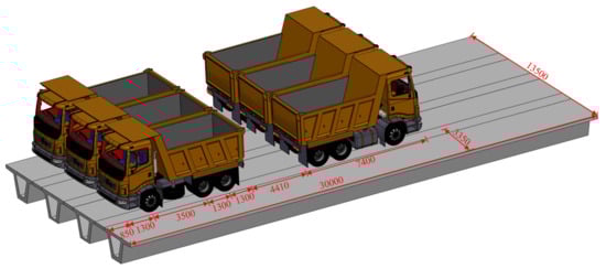 A static load test was conducted on the PCB bridge to validate the effectiveness of the finite element model. Strain and displacement sensors were used to measure the strain and deflection values at the midspan. According to the specification [], based on the investigation of the operating load of the PCB bridge (1.3 times the car over 20 classes), the control load during the static load test was selected, and a heavy vehicle of 35 tons was selected for loading through calculation; the dimensions of the vehicles are shown in Figure 9. The vehicles, characterized by a wheelbase of 1800 mm and an overall width of 2500 mm, feature a horizontal spacing of 1300 mm between adjacent truck axles.