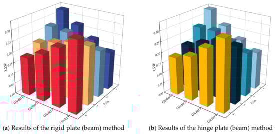 The hinged plate (beam) method is suitable for the concrete beam bridge with the wet joint connection of cast-in-place concrete, while the rigid plate (beam) method is suitable for the beam bridge with the inner transverse partition beam or the integral beam []. In this study, the main beams of the PCB bridge are connected by cast-in-place 180 mm thick wet joints. In practical engineering, the two adjacent main beams simultaneously transmit a transverse bending moment and a vertical shear force at the wet joints under vertical load, which is consistent with the basic assumption of the rigidly connected plate (beam) method. The span is provided with a transverse partition or CFSTT, which is consistent with the application range of the hinged plate method. Therefore, these two methods can be used for calculation. The hinged plate (beam) method is simple to calculate and can be applied to many types of bridges, but it is too simplified and ignores the difference in stiffness, so the results may not be accurate. The rigidly connected plate (beam) method takes stiffness into account and is highly accurate, but the calculation is complex and may still not cover all the complex factors in the actual load transfer process [].