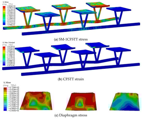 Figure 16a,b illustrate the stress–strain distribution within the CFSTTs of Model SM-1. Notably, significant stress concentrations are observed at the CFSTT nodes and along the bottom flanges, with peak stress values reaching approximately 3.804 × 102 MPa. This exceeds the yield strength of 235 MPa for the steel material utilized in the CFSTT of SM-1, indicating a transition into the post-elastic regime. In this phase, the stress–strain relationship deviates from proportionality, with the material undergoing plastic deformation. Despite these local plastic deformations, the overall stress distribution across the structure remains relatively uniform under load. This uniformity can be attributed to the composite action of concrete and steel in the CFSTT, leveraging the high strength of concrete and the confining effect of the steel tube. These attributes endow the CFSTT with commendable deformability and residual strength even at high stress levels. The maximum principal strain plots further delineate the deformation trends throughout the loading process, with the overall maximum strain values remaining at low levels, substantiating the CFSTT’s elastic behavior and ductility.